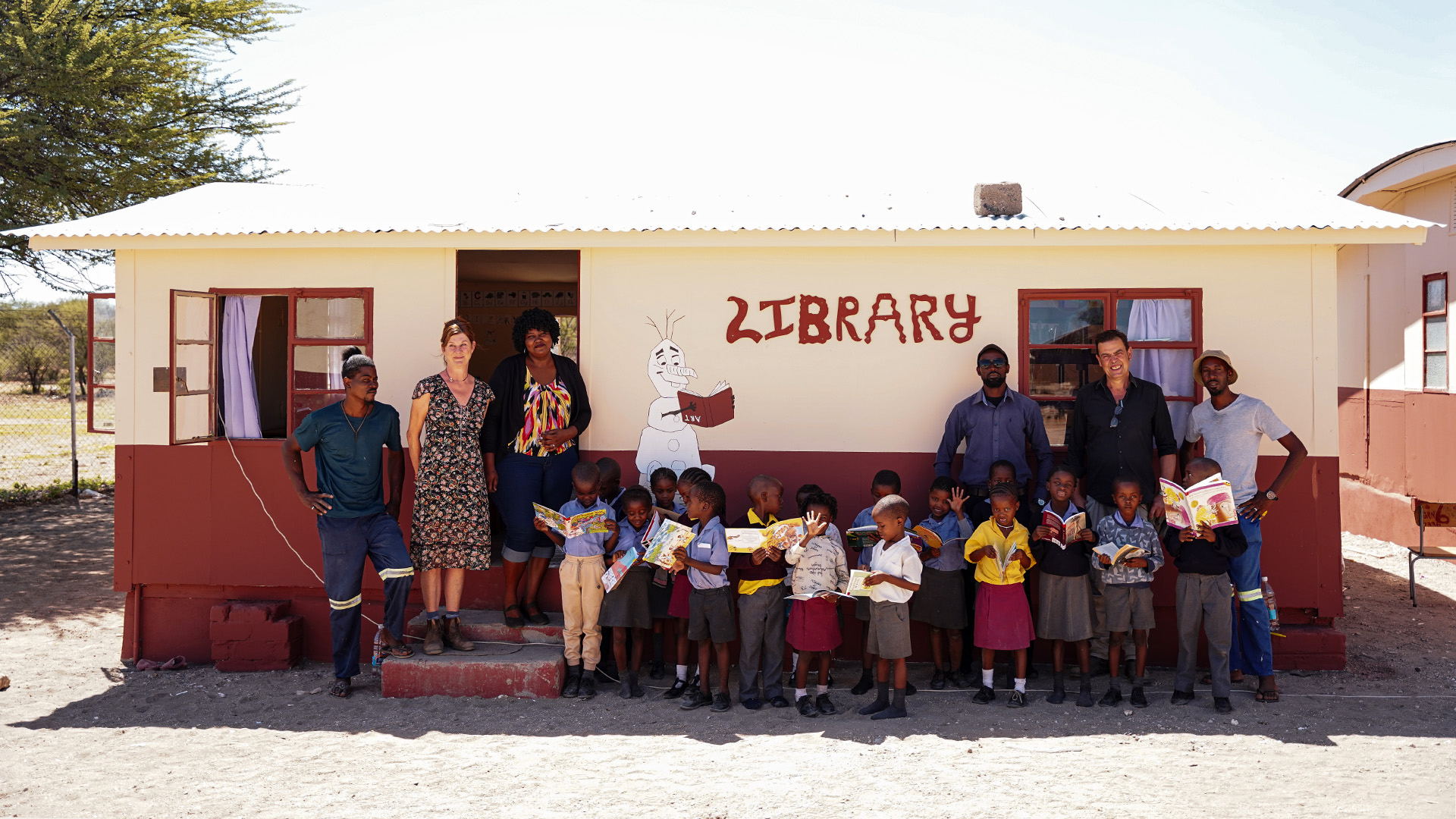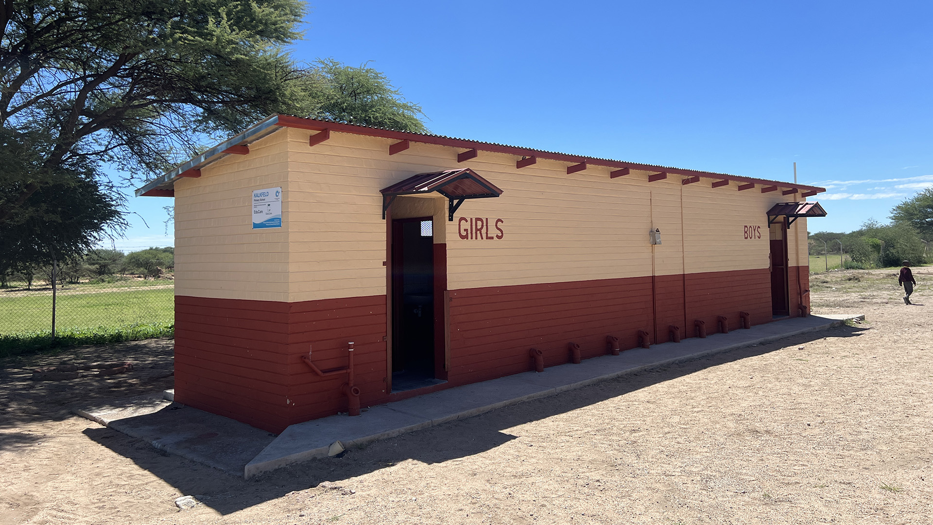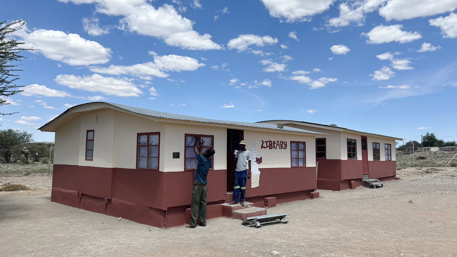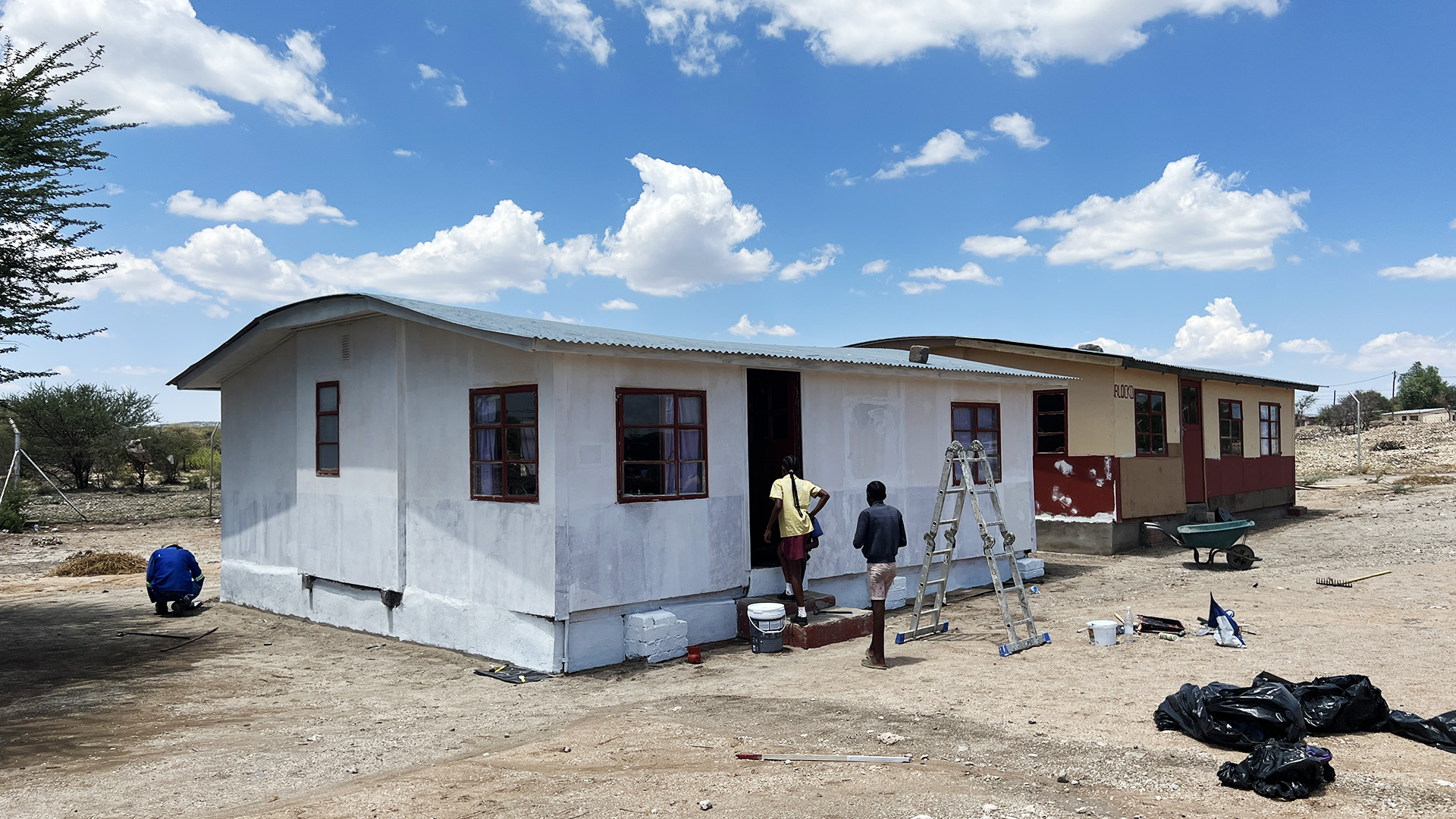 Even after 17 years, the school garden at Kalkfeld Primary School is still thriving, not only thanks to the green shade roof, but also thanks to the dedicated work of Mr. Marcelus, our gardening assistant. Knowledge is also shared in the nursery, for example about seedlings and cuttings. / In 2024, we were able to complete the exterior renovation of the classrooms that had previously been relocated and already renovated on the inside. Mr. Paco, Mr. Harry, and Mr. Marcelus did a great job, often using recycled materials. The former mobile classrooms are now firmly anchored and electrified, creating new, functional learning spaces with few resources. One room became the new school library: “Why do you like the library?” – “Because it’s PURPLE!” / Shawn, a former student, designed the “art on the building,” and Mr. Festus, a library science student, manages the new library, which we opened in February. / We also tackled the long-standing restroom problem this year. The toilet block for the students was completely renovated – with a new roof, new pipes, and better visibility thanks to staggered entrances. In addition, we were able to build two new teachers’ toilets in a storage room, as a single toilet for 19 teachers and staff on the large campus was simply not enough. / A special highlight: the Namibian premiere of our new film ClassRoomSculpture (2023) in the school hall. The documentary shows the three new classrooms as a socially engaged sculpture—with teachers, students, and parents in the leading roles. An emotional, celebrated moment. / In addition, we were able to offer numerous workshops, from “Tomato Transplant” to “Library Typo” to “Girlstalk” with Ms. Ronna and Ms. Petra. / The GO BEAM Academy also continues to grow: at the GO BEAM Kindergarten, Ms. Christophine and Ms. Isolda inspire the youngest children with playful learning. The GO BEAM Afternoon Classes are supported by former students – and there is even a computer lab in the works! Ms. Matilda !Kharuchas, former headmistress of the Primary School and director of the GO BEAM Academy, keeps everything running smoothly.