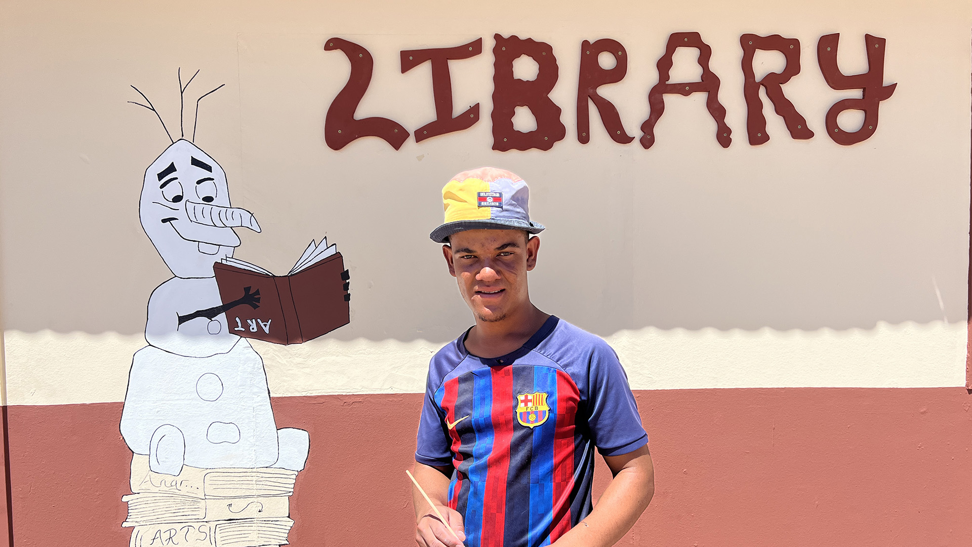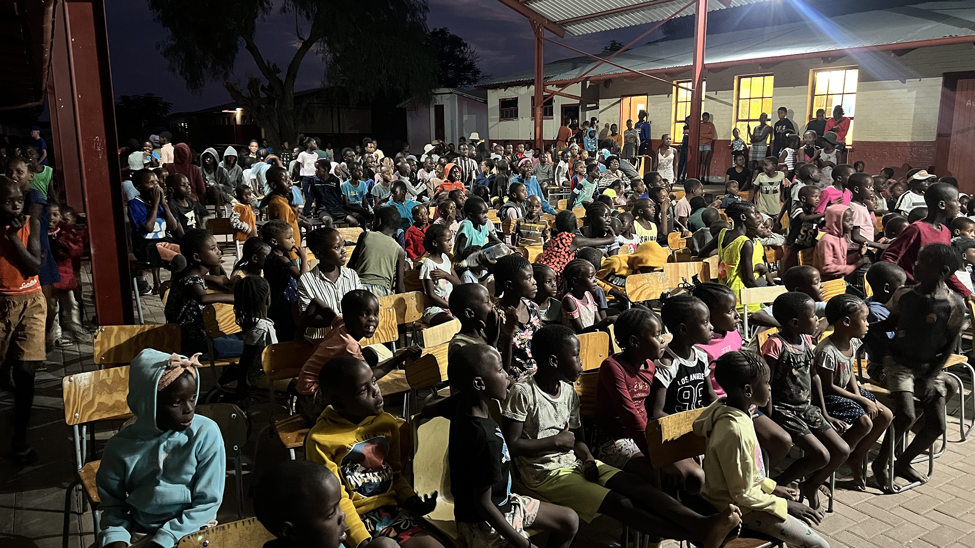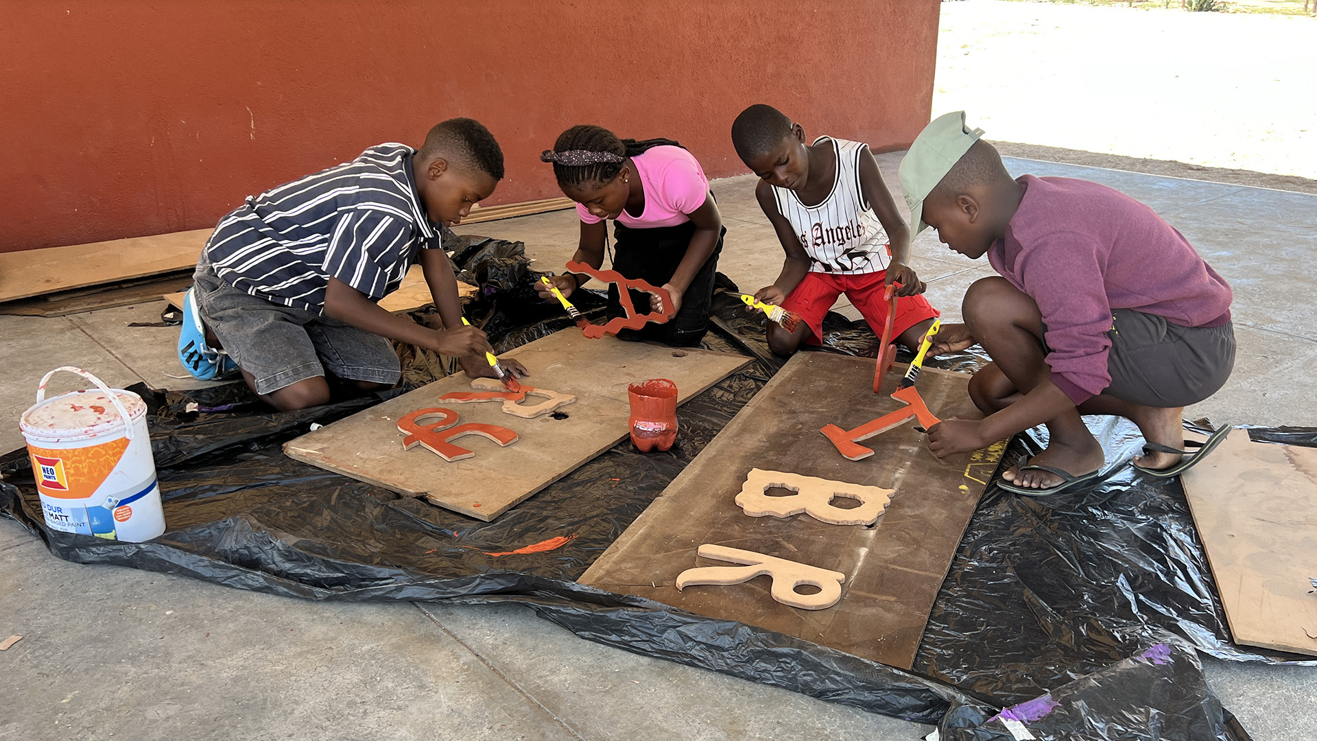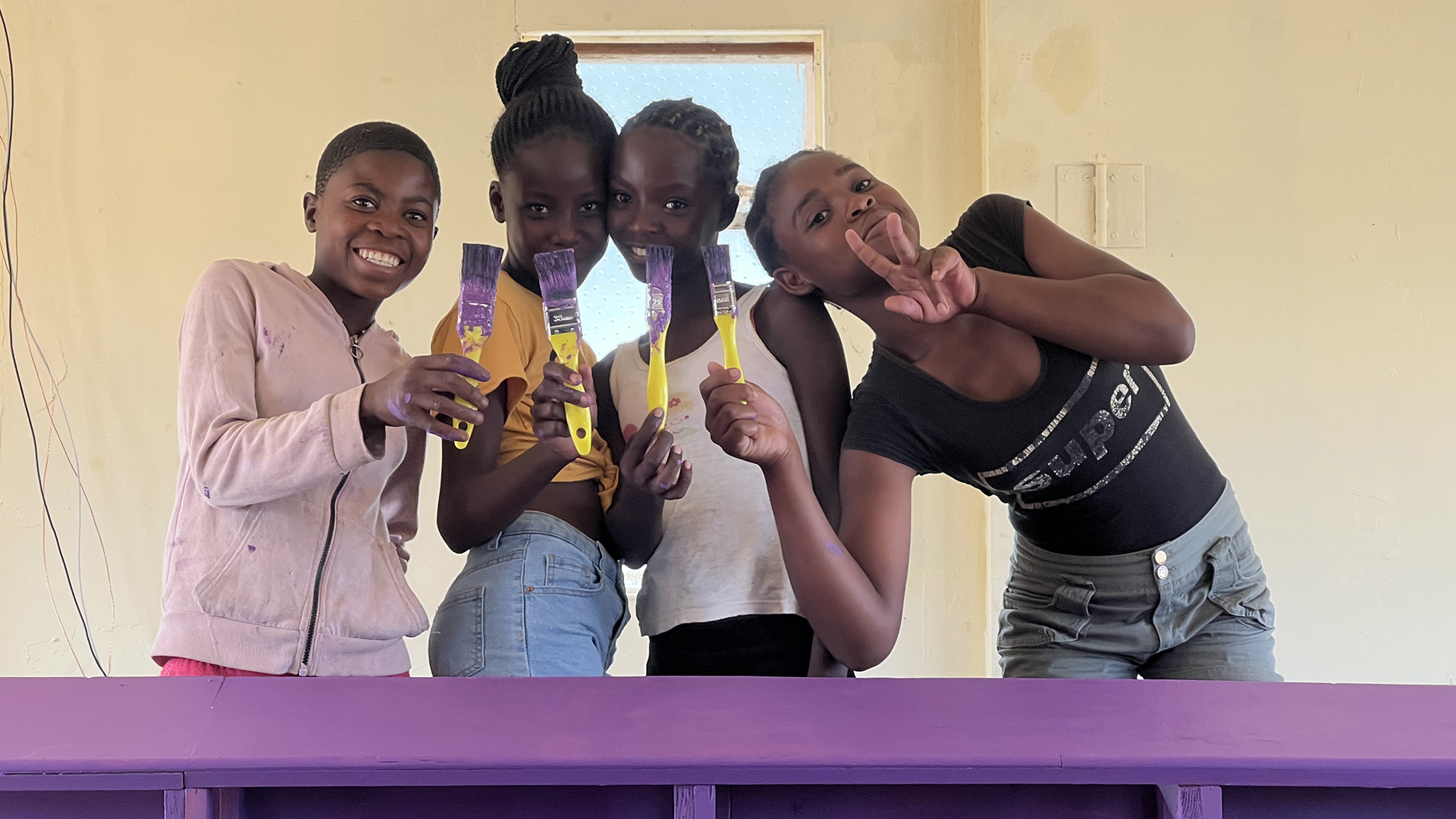 Even after 17 years, the school garden at Kalkfeld Primary School is still thriving, not only thanks to the green shade roof, but also thanks to the dedicated work of Mr. Marcelus, our gardening assistant. Knowledge is also shared in the nursery, for example about seedlings and cuttings. / In 2024, we were able to complete the exterior renovation of the classrooms that had previously been relocated and already renovated on the inside. Mr. Paco, Mr. Harry, and Mr. Marcelus did a great job, often using recycled materials. The former mobile classrooms are now firmly anchored and electrified, creating new, functional learning spaces with few resources. One room became the new school library: “Why do you like the library?” – “Because it’s PURPLE!” / Shawn, a former student, designed the “art on the building,” and Mr. Festus, a library science student, manages the new library, which we opened in February. / We also tackled the long-standing restroom problem this year. The toilet block for the students was completely renovated – with a new roof, new pipes, and better visibility thanks to staggered entrances. In addition, we were able to build two new teachers’ toilets in a storage room, as a single toilet for 19 teachers and staff on the large campus was simply not enough. / A special highlight: the Namibian premiere of our new film ClassRoomSculpture (2023) in the school hall. The documentary shows the three new classrooms as a socially engaged sculpture—with teachers, students, and parents in the leading roles. An emotional, celebrated moment. / In addition, we were able to offer numerous workshops, from “Tomato Transplant” to “Library Typo” to “Girlstalk” with Ms. Ronna and Ms. Petra. / The GO BEAM Academy also continues to grow: at the GO BEAM Kindergarten, Ms. Christophine and Ms. Isolda inspire the youngest children with playful learning. The GO BEAM Afternoon Classes are supported by former students – and there is even a computer lab in the works! Ms. Matilda !Kharuchas, former headmistress of the Primary School and director of the GO BEAM Academy, keeps everything running smoothly.