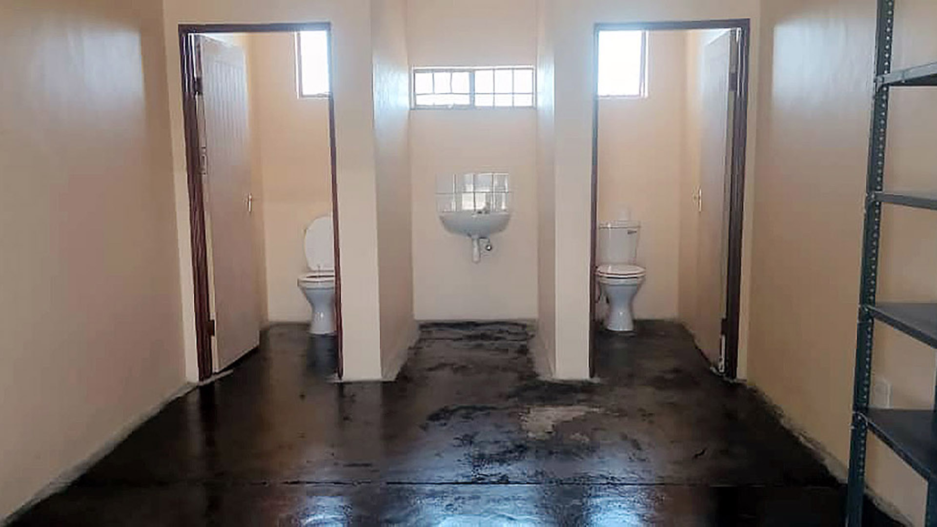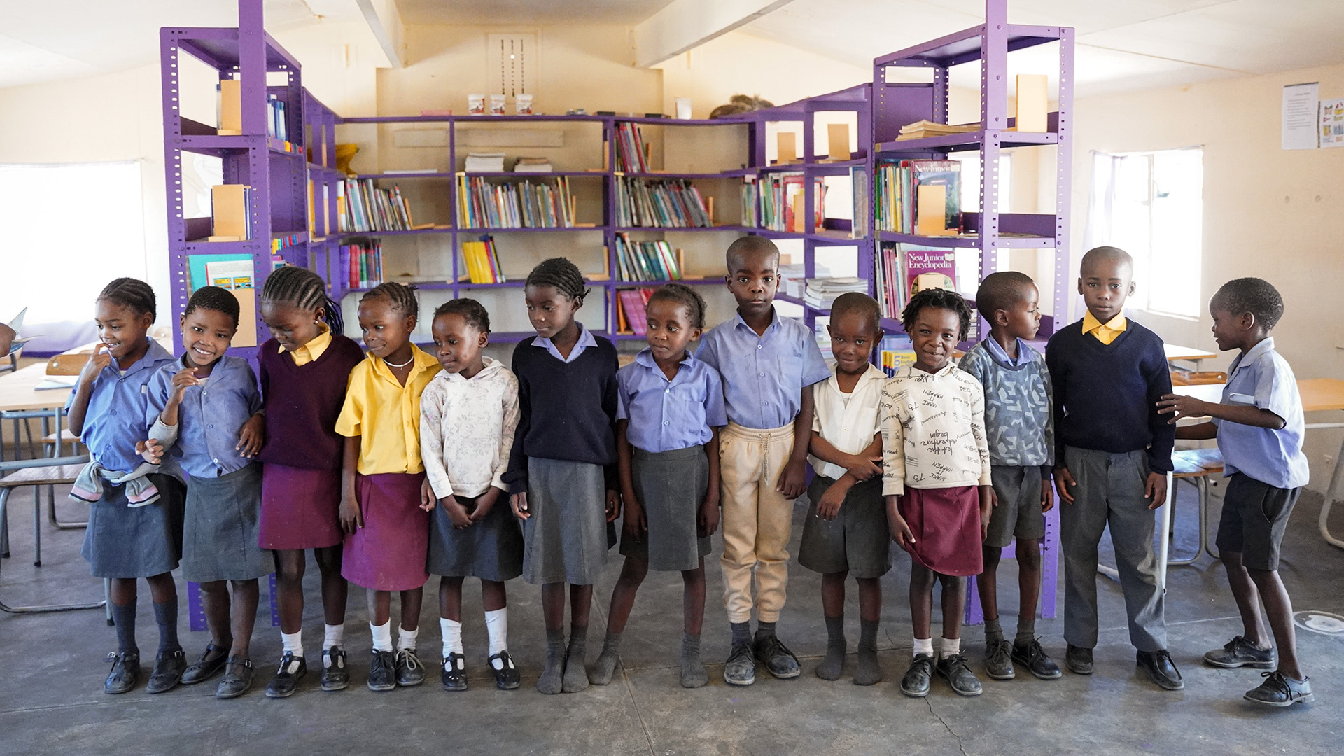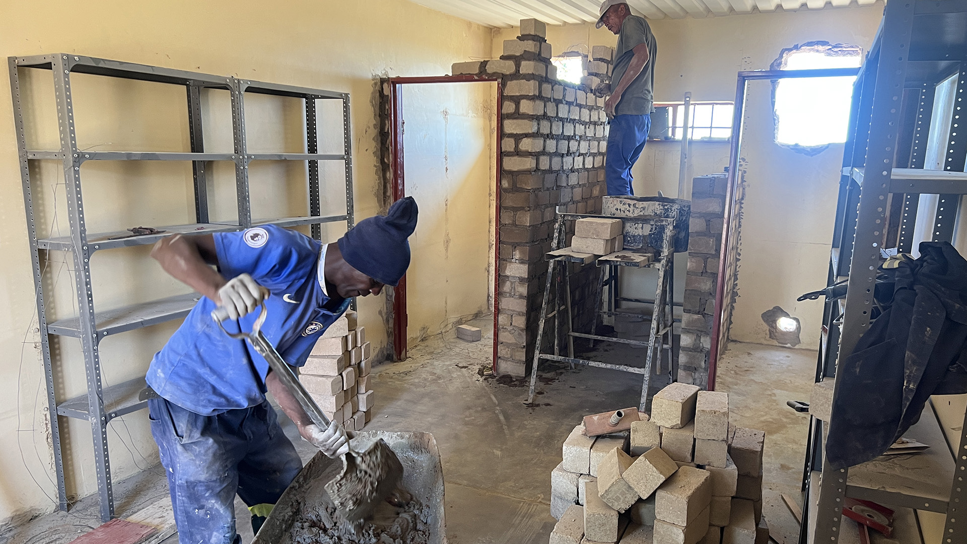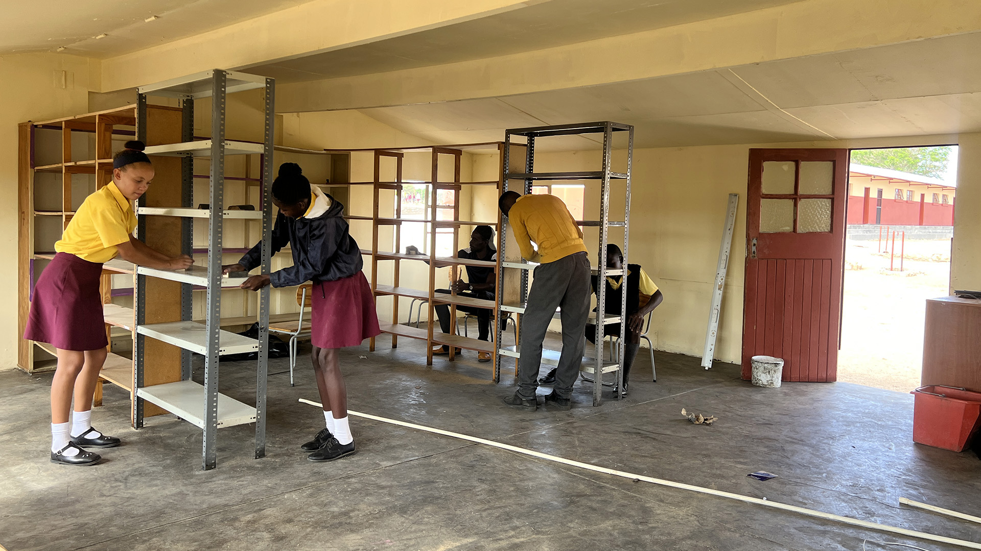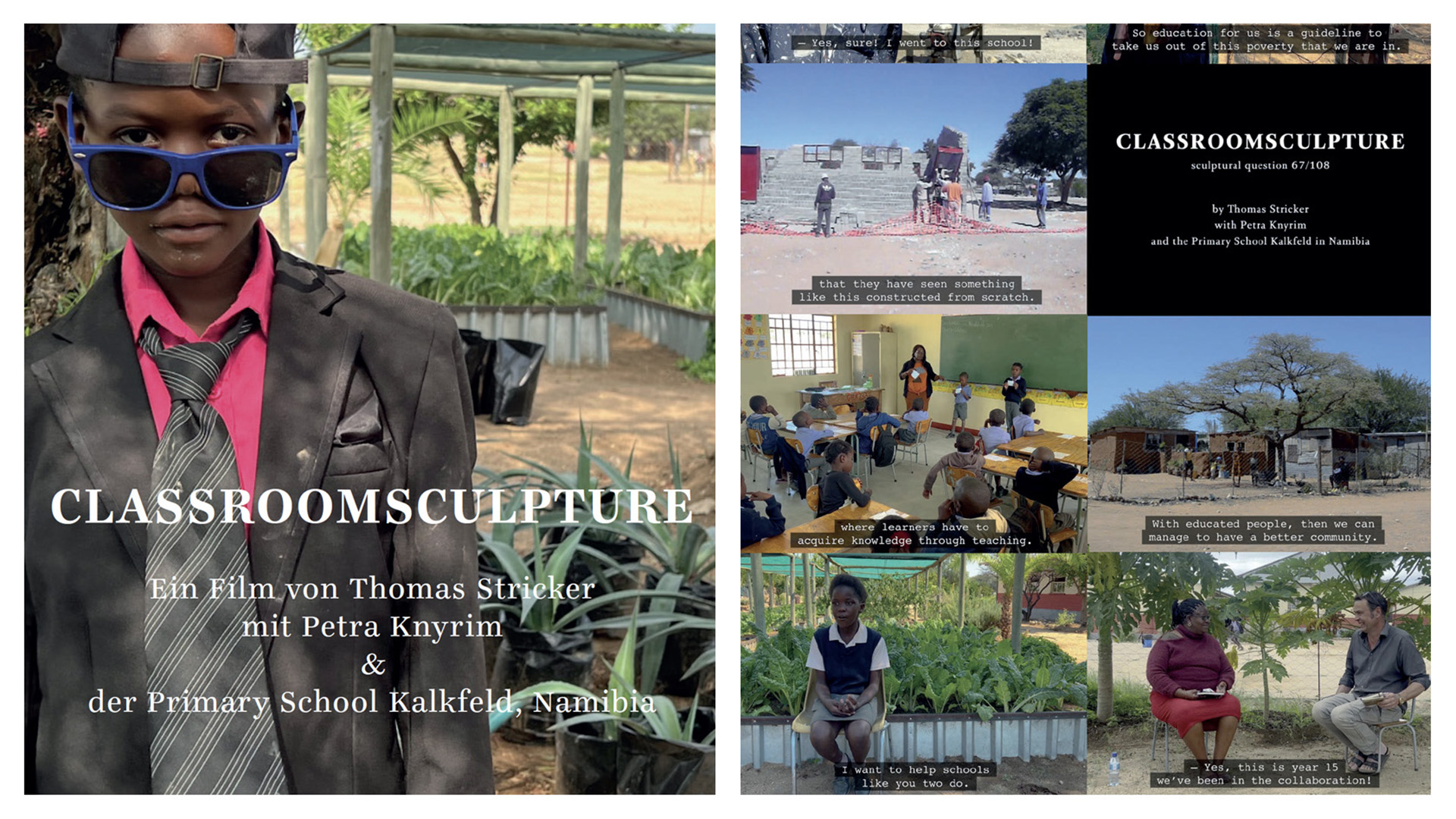 Even after 17 years, the school garden at Kalkfeld Primary School is still thriving, not only thanks to the green shade roof, but also thanks to the dedicated work of Mr. Marcelus, our gardening assistant. Knowledge is also shared in the nursery, for example about seedlings and cuttings. / In 2024, we were able to complete the exterior renovation of the classrooms that had previously been relocated and already renovated on the inside. Mr. Paco, Mr. Harry, and Mr. Marcelus did a great job, often using recycled materials. The former mobile classrooms are now firmly anchored and electrified, creating new, functional learning spaces with few resources. One room became the new school library: “Why do you like the library?” – “Because it’s PURPLE!” / Shawn, a former student, designed the “art on the building,” and Mr. Festus, a library science student, manages the new library, which we opened in February. / We also tackled the long-standing restroom problem this year. The toilet block for the students was completely renovated – with a new roof, new pipes, and better visibility thanks to staggered entrances. In addition, we were able to build two new teachers’ toilets in a storage room, as a single toilet for 19 teachers and staff on the large campus was simply not enough. / A special highlight: the Namibian premiere of our new film ClassRoomSculpture (2023) in the school hall. The documentary shows the three new classrooms as a socially engaged sculpture—with teachers, students, and parents in the leading roles. An emotional, celebrated moment. / In addition, we were able to offer numerous workshops, from “Tomato Transplant” to “Library Typo” to “Girlstalk” with Ms. Ronna and Ms. Petra. / The GO BEAM Academy also continues to grow: at the GO BEAM Kindergarten, Ms. Christophine and Ms. Isolda inspire the youngest children with playful learning. The GO BEAM Afternoon Classes are supported by former students – and there is even a computer lab in the works! Ms. Matilda !Kharuchas, former headmistress of the Primary School and director of the GO BEAM Academy, keeps everything running smoothly.