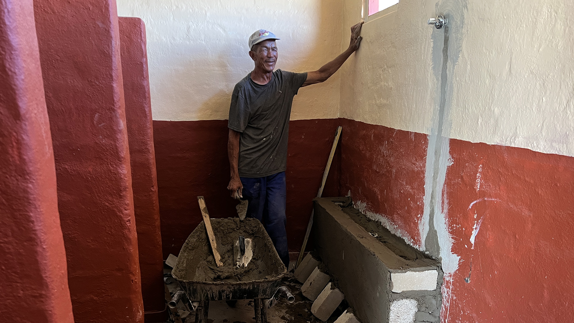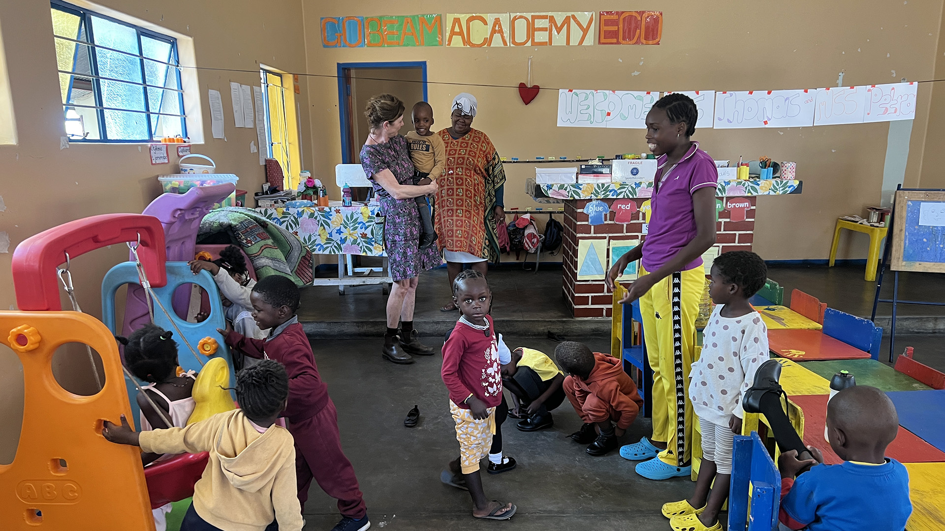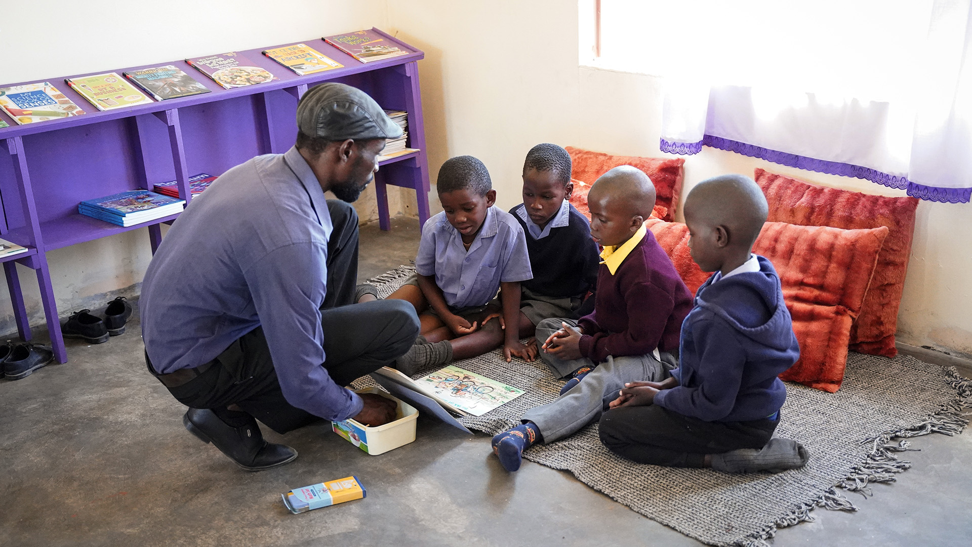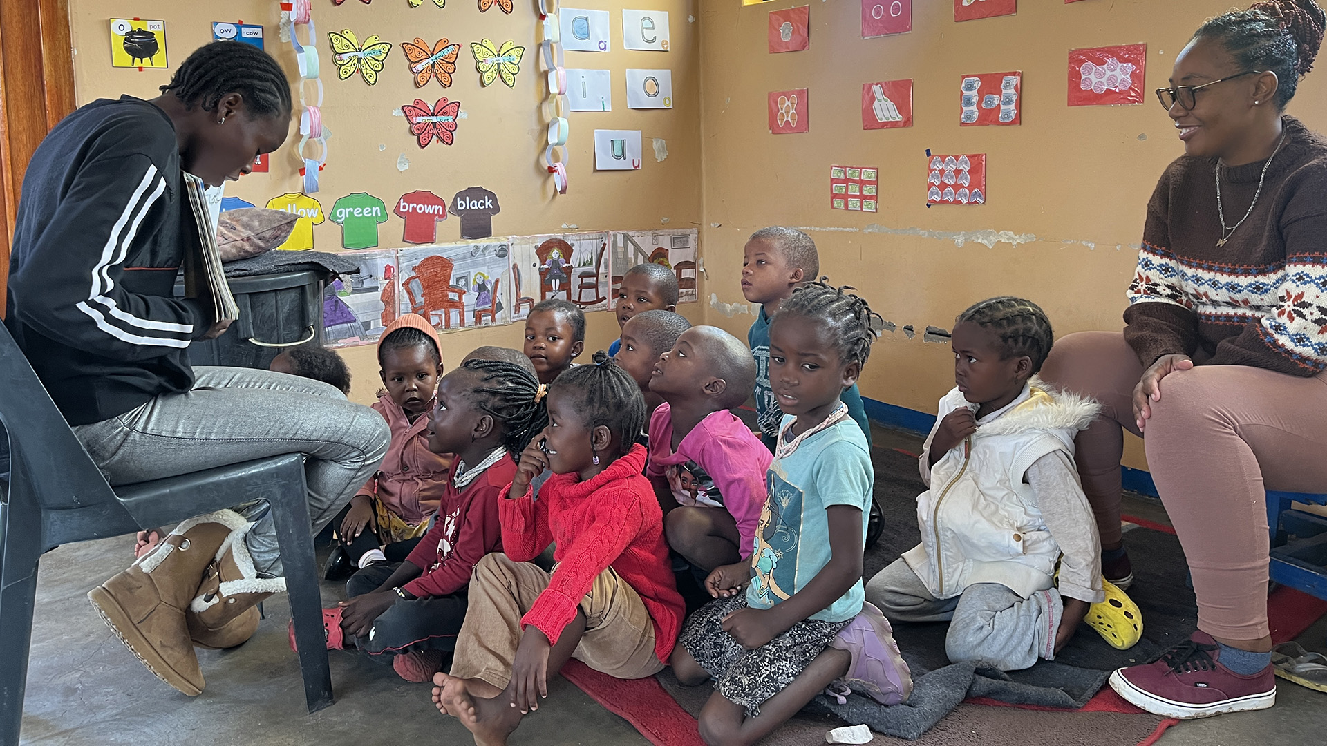 Even after 17 years, the school garden at Kalkfeld Primary School is still thriving, not only thanks to the green shade roof, but also thanks to the dedicated work of Mr. Marcelus, our gardening assistant. Knowledge is also shared in the nursery, for example about seedlings and cuttings. / In 2024, we were able to complete the exterior renovation of the classrooms that had previously been relocated and already renovated on the inside. Mr. Paco, Mr. Harry, and Mr. Marcelus did a great job, often using recycled materials. The former mobile classrooms are now firmly anchored and electrified, creating new, functional learning spaces with few resources. One room became the new school library: “Why do you like the library?” – “Because it’s PURPLE!” / Shawn, a former student, designed the “art on the building,” and Mr. Festus, a library science student, manages the new library, which we opened in February. / We also tackled the long-standing restroom problem this year. The toilet block for the students was completely renovated – with a new roof, new pipes, and better visibility thanks to staggered entrances. In addition, we were able to build two new teachers’ toilets in a storage room, as a single toilet for 19 teachers and staff on the large campus was simply not enough. / A special highlight: the Namibian premiere of our new film ClassRoomSculpture (2023) in the school hall. The documentary shows the three new classrooms as a socially engaged sculpture—with teachers, students, and parents in the leading roles. An emotional, celebrated moment. / In addition, we were able to offer numerous workshops, from “Tomato Transplant” to “Library Typo” to “Girlstalk” with Ms. Ronna and Ms. Petra. / The GO BEAM Academy also continues to grow: at the GO BEAM Kindergarten, Ms. Christophine and Ms. Isolda inspire the youngest children with playful learning. The GO BEAM Afternoon Classes are supported by former students – and there is even a computer lab in the works! Ms. Matilda !Kharuchas, former headmistress of the Primary School and director of the GO BEAM Academy, keeps everything running smoothly.