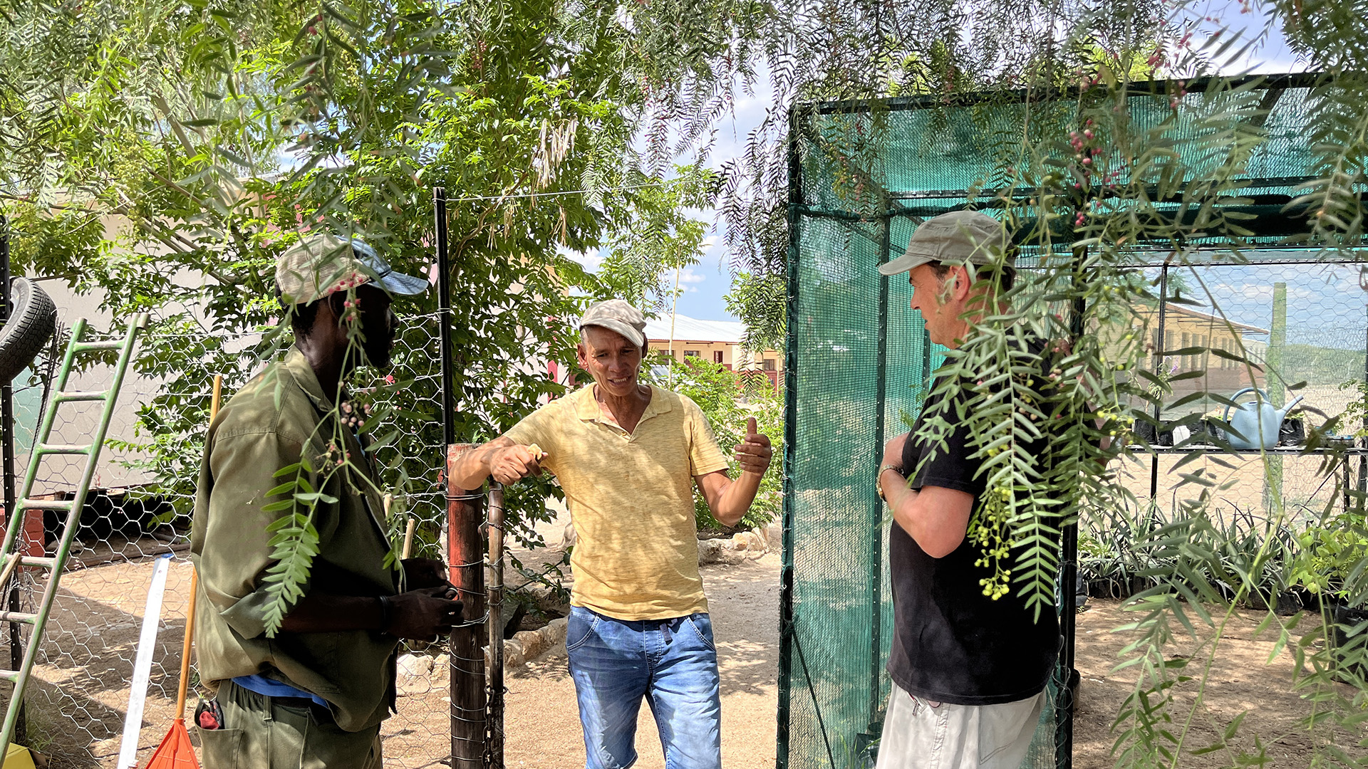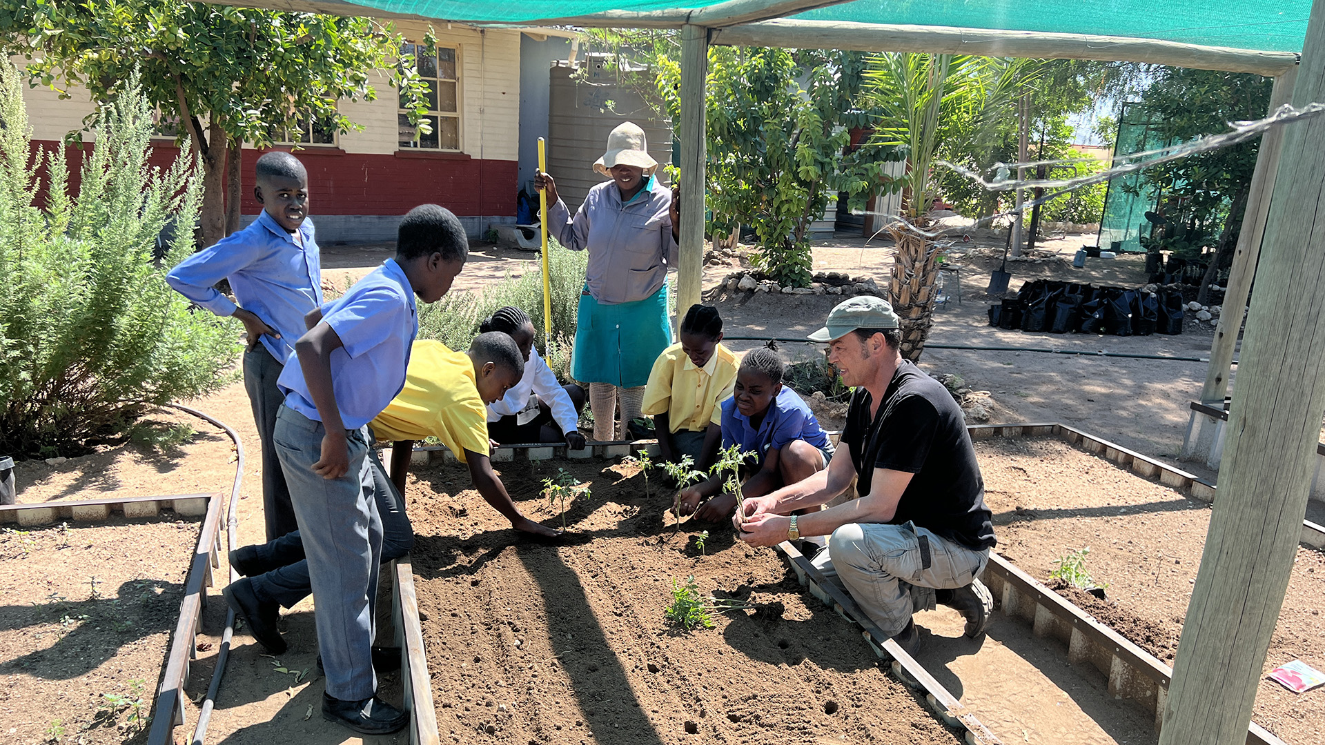 In April 2023 we travel again to this beautiful african soil, to Namibia, to the Primary School in Kalkfeld… / …where a blooming school garden welcomes us. / Miss Lydia and Mister Marcellus are the good souls of the garden. / The school children love the garden and are teached agriculture there. / The harvest from the school garden is processed by the cooking lady in the firewood kitchen. / Right next to the school area, we built the GO BEAM kindergarten in 2022. / In which over 20 street children are now registered… / …and where there is also a little homework support. / There is now a small laundry in the township… / … and with Miss Sassy, we built up a chips shop as a result of the vision sharing meeting. / Also this year we have the postcards workshop… / … the girls talk… / and the beloved repair the chair workshop. / In which there are now also tables… / and cabinets are repaired and built. / The result fills us all with joy and pride! / And then there are the old classrooms, which we moved in 2021 and wich we are now renovating. / The students are all happy to help us. / Thank you so much, Mister Marco Shiseo and the team at Primary School Kalkfeld!